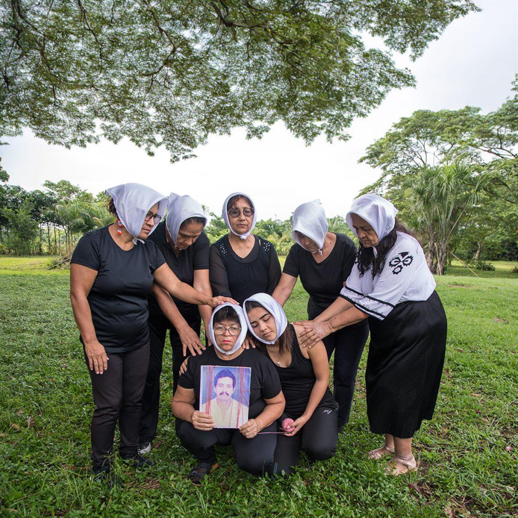Las mujeres de El Tente rinden un conmovedor homenaje a Silvio, el compañero de vida de Carmen, desaparecido hace 30 años por el conflicto armado. Vestidas de negro con pañuelos blancos en la cabeza, símbolo de resistencia y lucha de las Madres de Plaza de Mayo de Argentina, crean una imagen poderosa al juntarse alrededor de la foto de Silvio que Carmen lleva consigo.